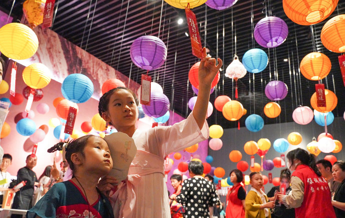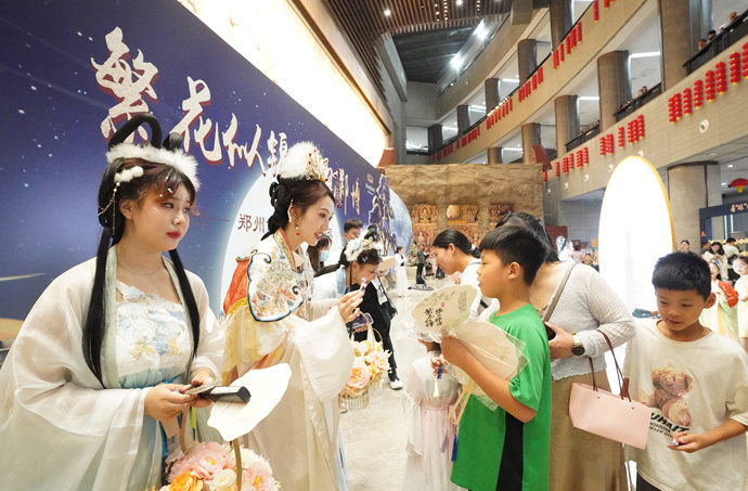 “嫦娥姐姐真漂亮,我想跟她合个影!”“快看玉兔,真可爱!”走进郑州博物馆大厅,小观众惊喜地发现了熟悉又喜爱的“神仙”,火遍全球的“黑悟空”也带着金箍棒现身,纷纷“求合影”;不一会儿,二楼猜灯谜、对诗、盖章打卡等地也排起了长队;不少观众身着汉服,手持团扇、笑意盈盈,游走在各处活动地点,中秋夜游氛围感满满。