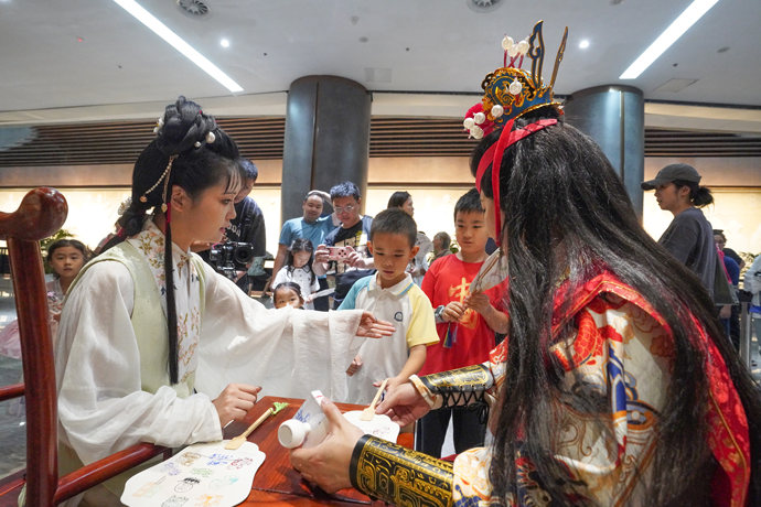 除了精彩的文化活动,郑州博物馆16个展厅免费向观众开放并提供义务讲解服务;还有“小志愿者”“保洁阿姨”等具有特殊身份的讲解员现身各个展厅,向观众娓娓道来文物故事。嫦娥仙子、宝玉、黛玉、苏轼等多名NPC随着悠扬的背景音乐穿梭在场馆内,随机赠送观众“惊喜礼物”,为活动增添了古风雅韵,给观众带来了沉浸的游玩体验。活动现场,人声鼎沸,热闹非凡。